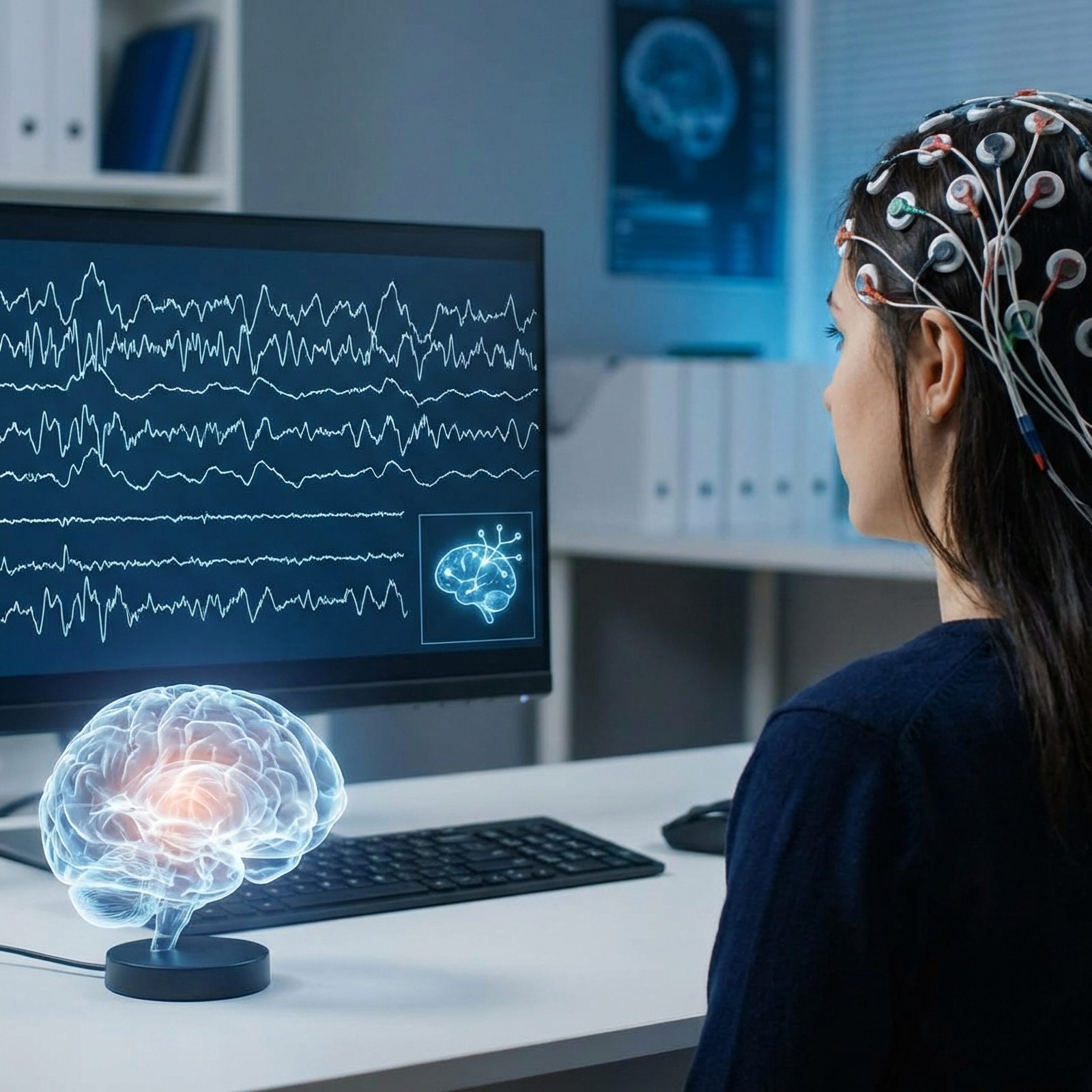 Small, non-invasive electrodes are placed on the scalp to measure brainwave activity. The EEG (electroencephalogram) records real-time electrical activity from different regions of the brain.